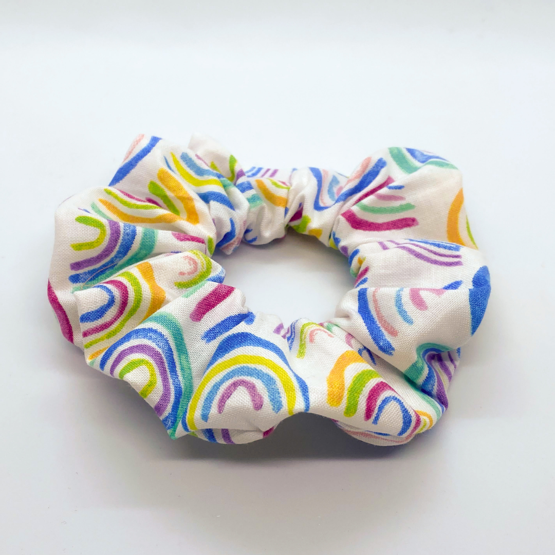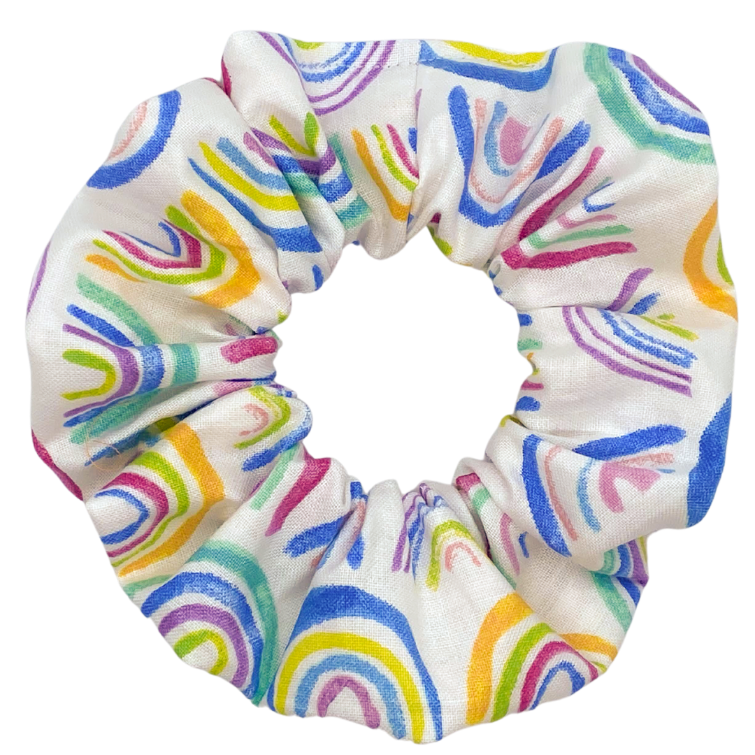 I love a good rainbow - reminds me that after a storm comes some beauty. It's like a little sign of hope - and they are downright adorable in this print. Catch the rainbow in this scrunchie and wear it with pride. :)