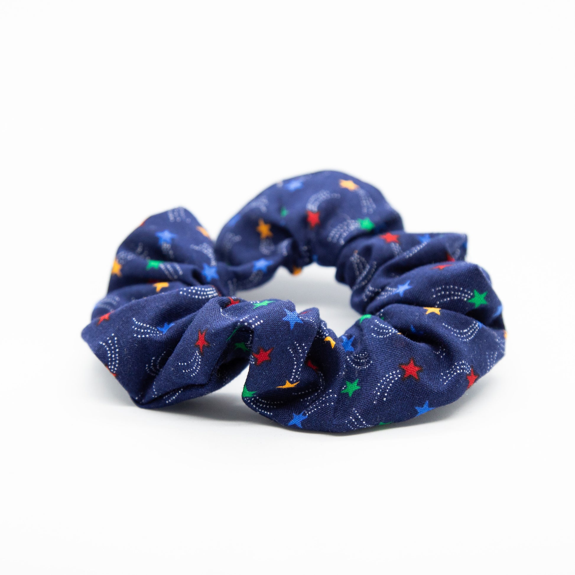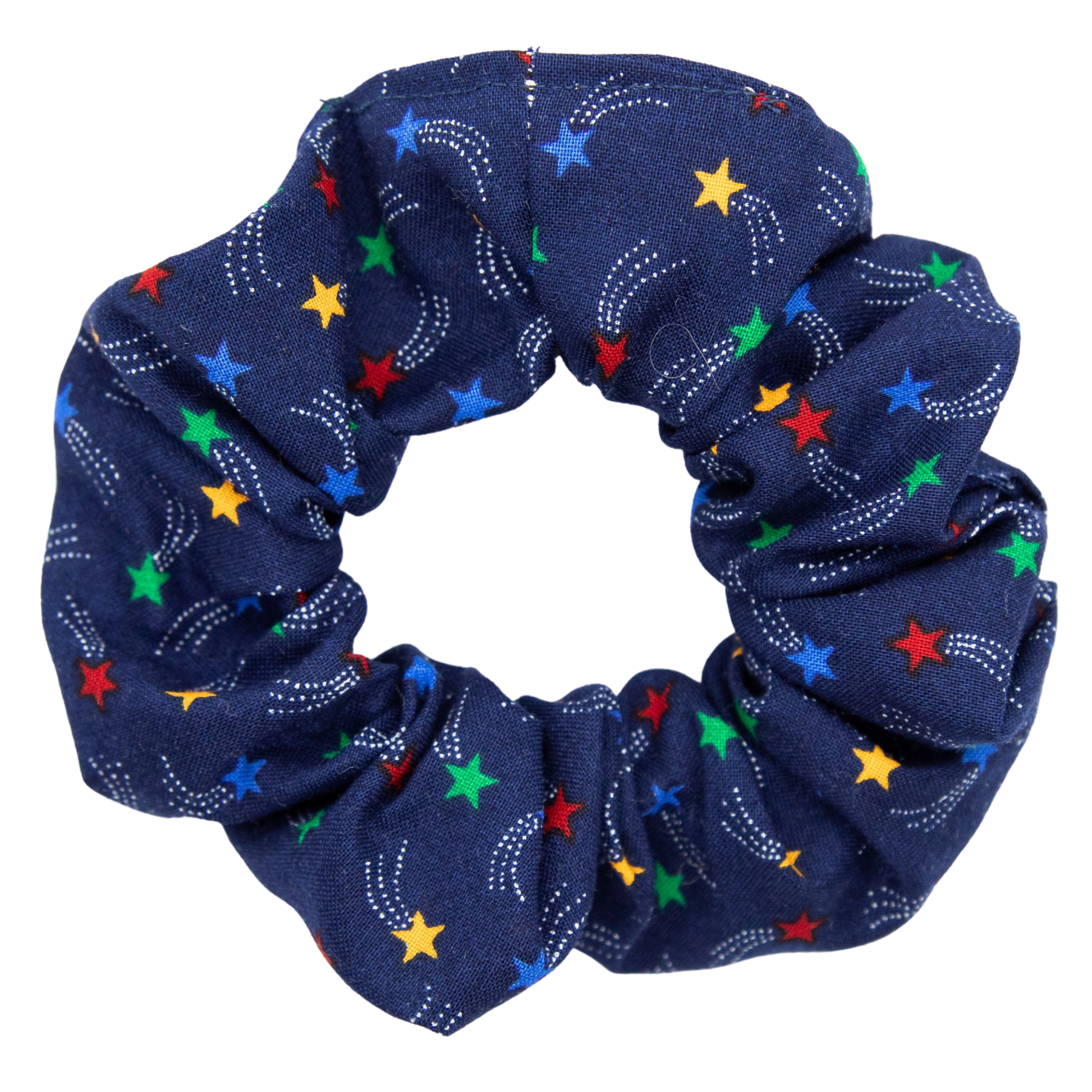 Covering in wishes, catch these shooting stars in a scrunchie. Covered with blue, gold, green, and red stars, this scrunchie will add some cute to your hair, but has a little subtle feel with is strong contrasting navy background.