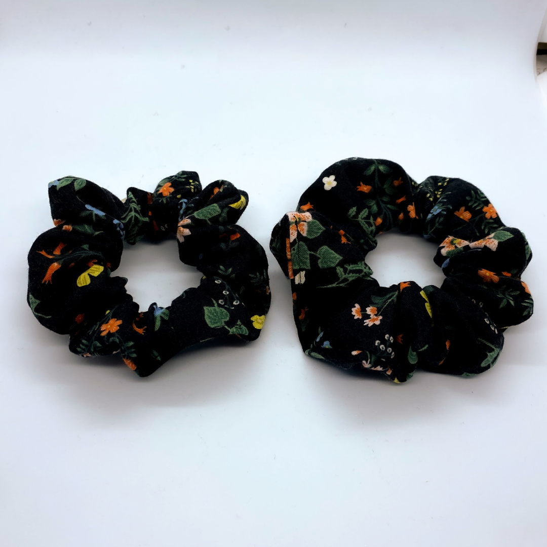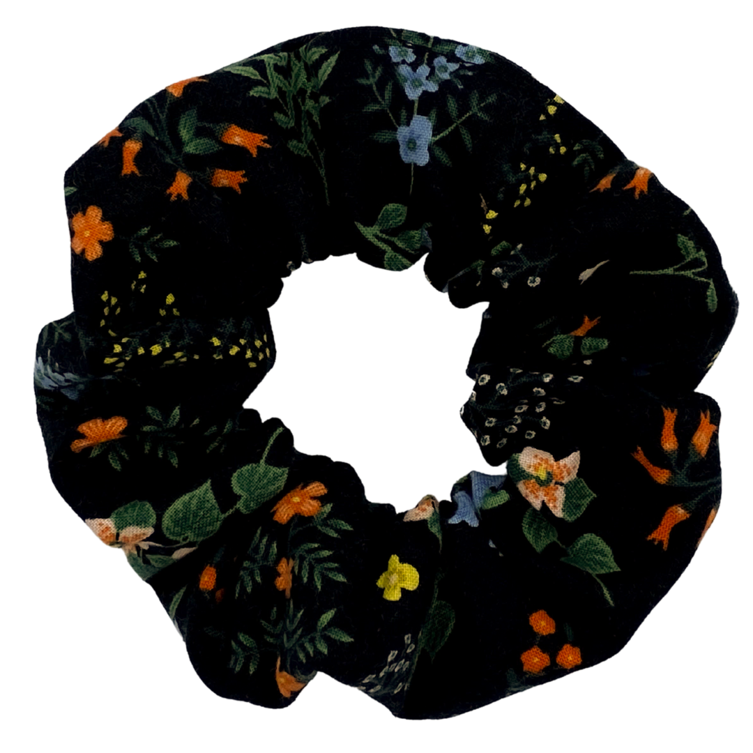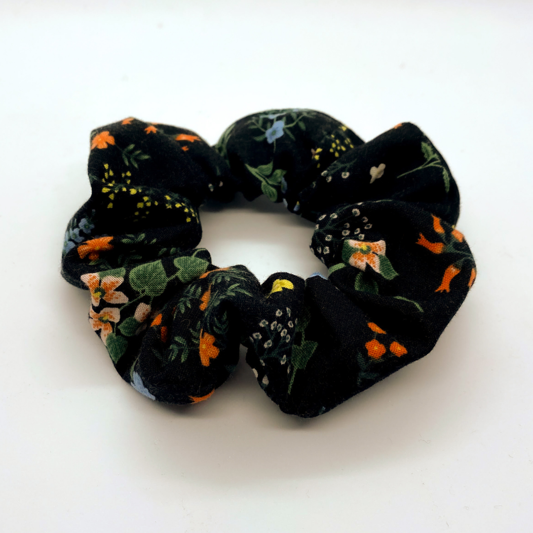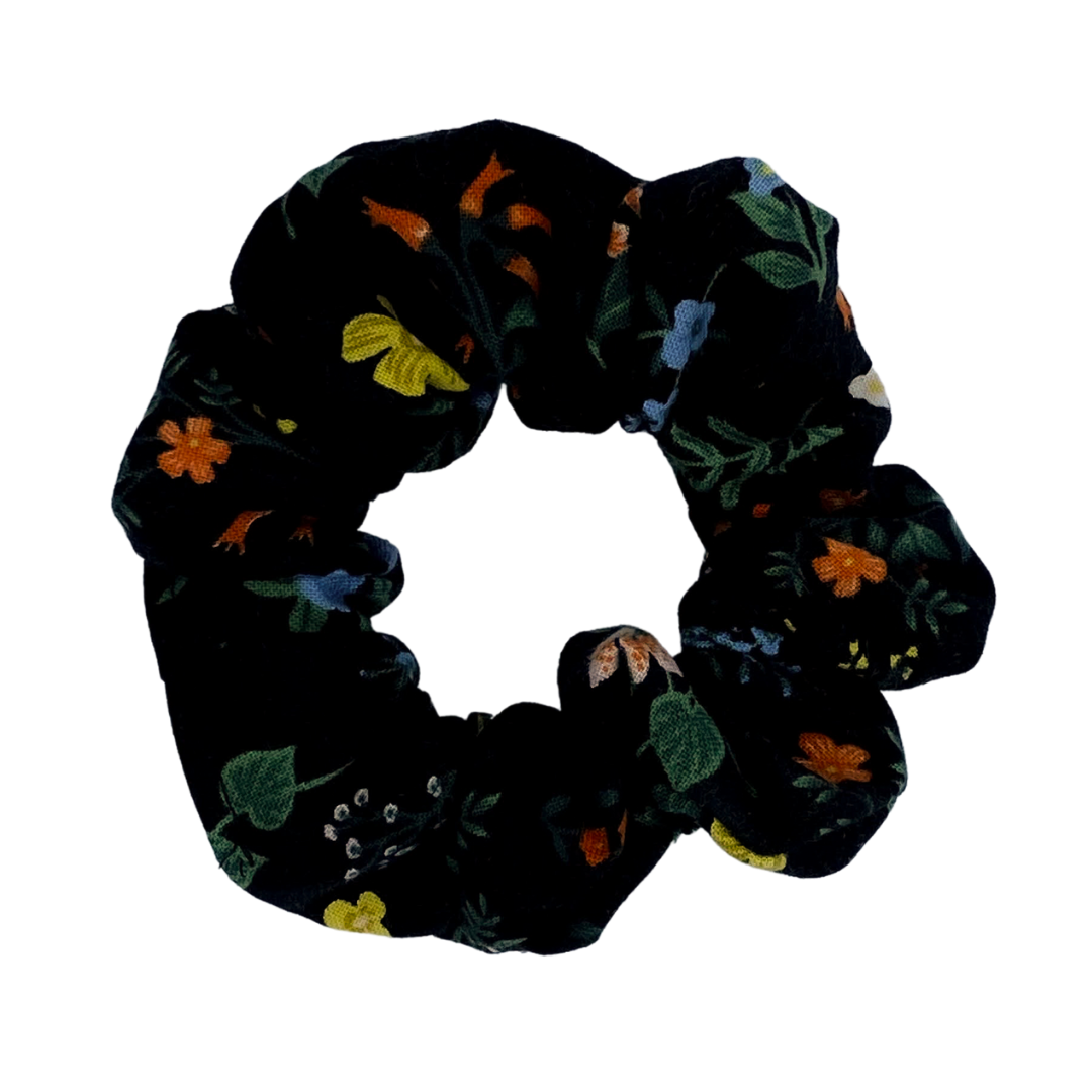 Another gorgeous print by Rifle Paper Company featuring a variety of adorable flowers contrasted with a black backdrop. This scrunchie adds that little pop of colour and sophistication. A truly fancy addition to any scrunchie collection!