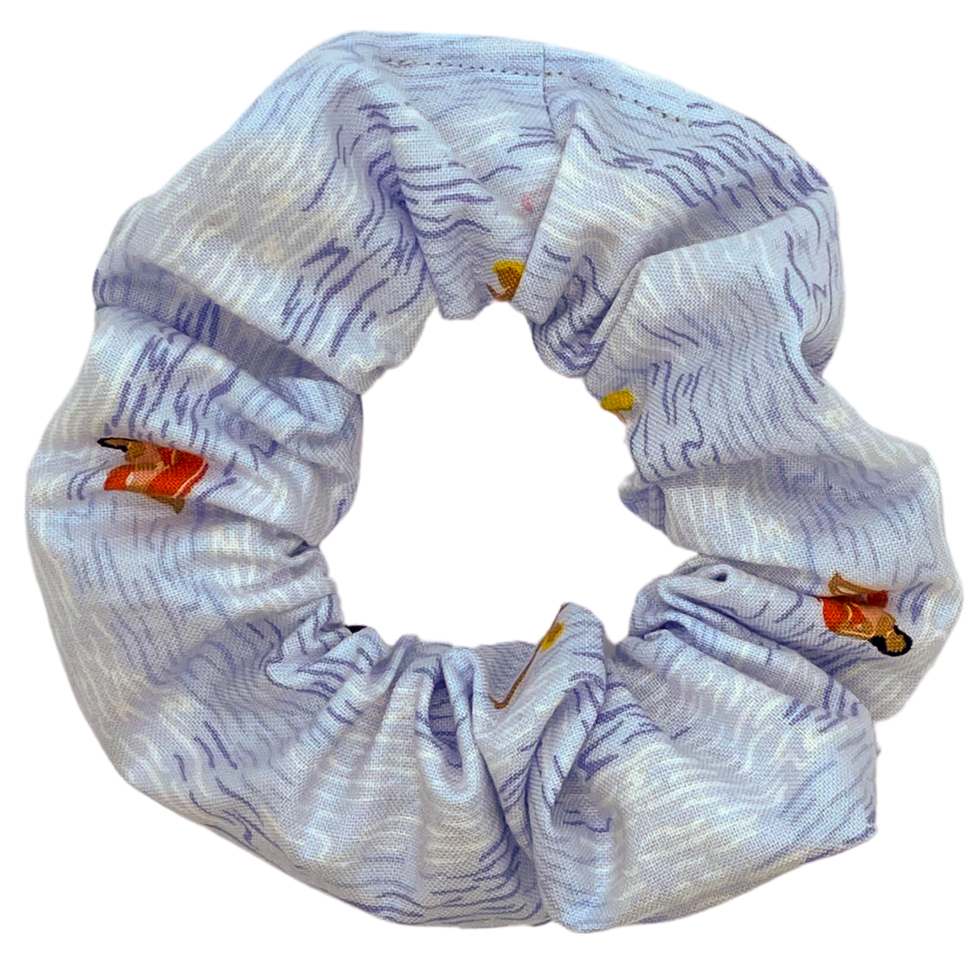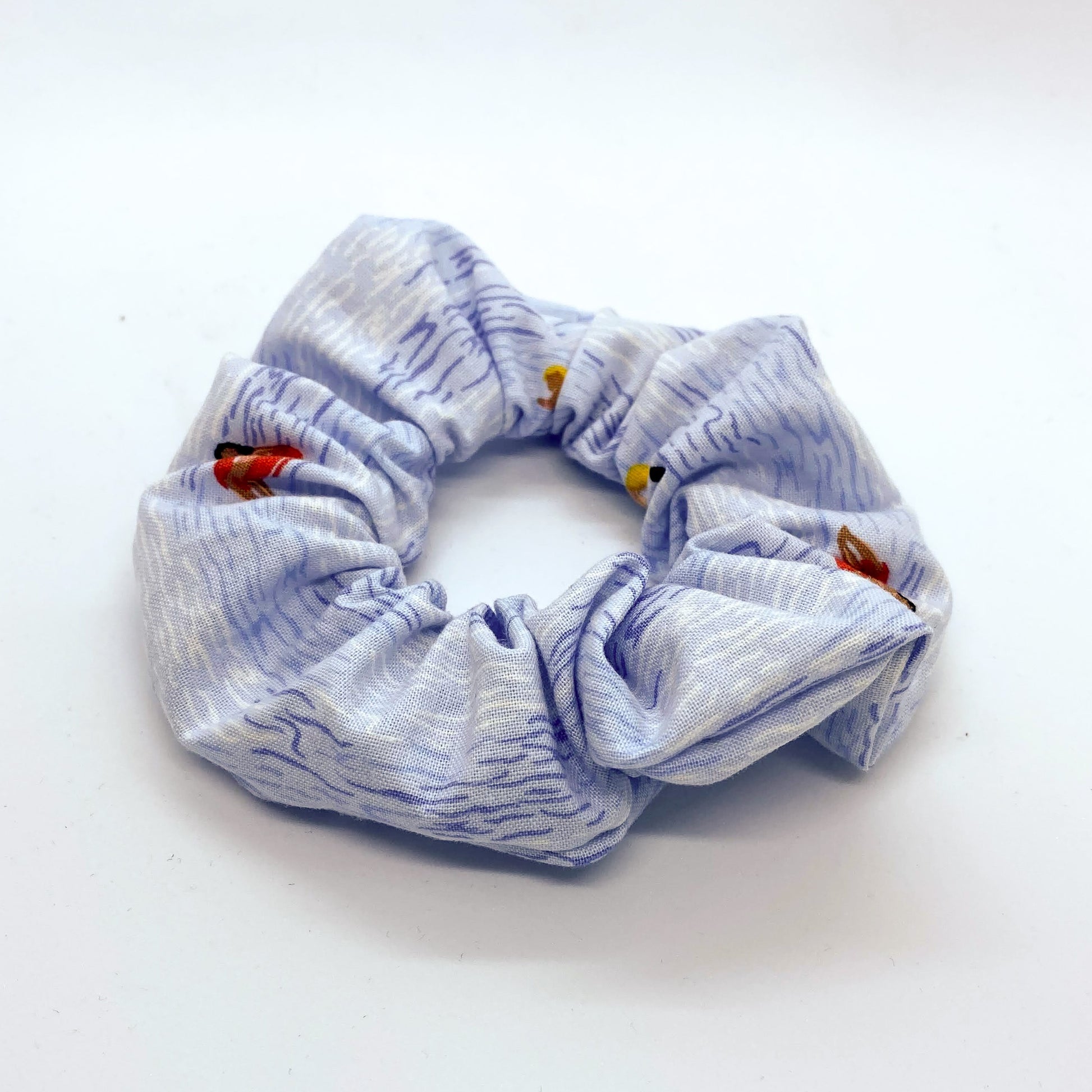 I love working with patterns like this because each scrunchie is different from the rest. Covered in little pool-goers you've got people lounging in inner tubes, playing water polo, lying on paddle boards, you name it! The colour is a pretty pale blue reminiscent of hot summer days at the pool or taking a dip on a hot day in the sun.