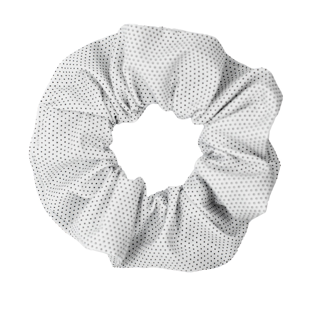 Covered in little black polka dots on a white backdrop, there's something sweet and special about this scrunchie.