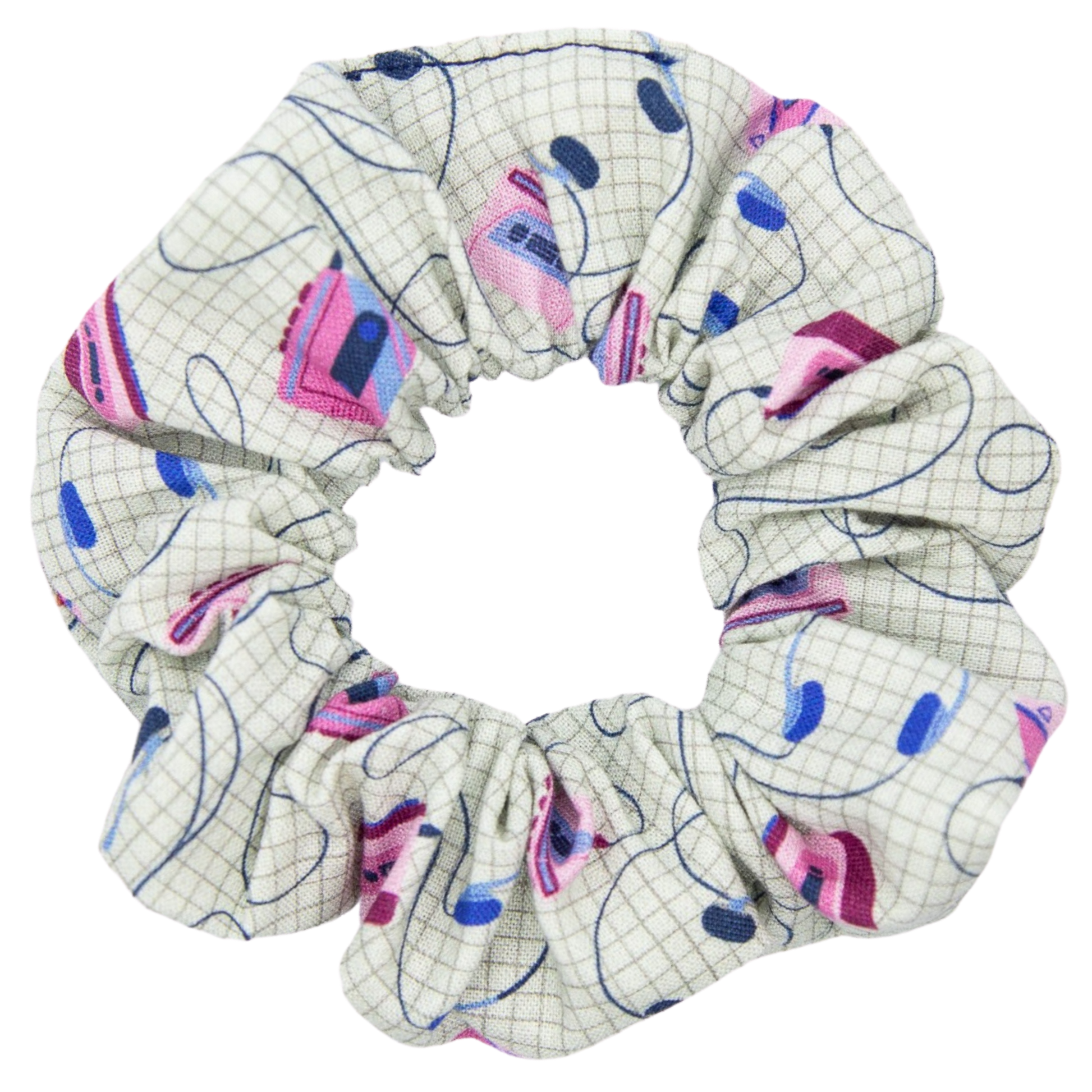 I see you Gen X! Let's go way back with this retro callback to the first major portable music player - the Walkman! Covered with cute little pink walkmans with their over-the-ear headphones, this little scrunchie has you covered for #tbt